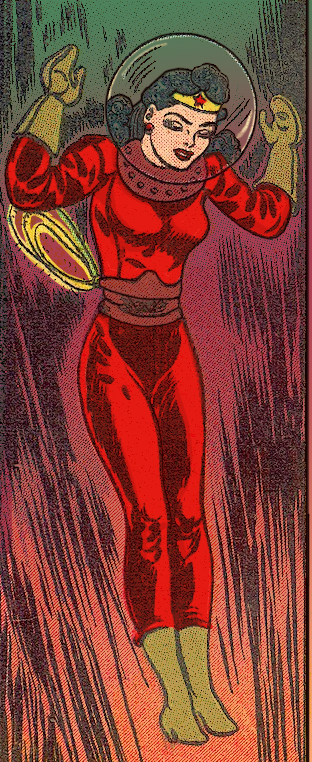 In 1947 Diana fought the scientist queen Atomia, who sought to steal and use all the uranium on earth. The strange queen ended up locked into a mind controlling Venus Girdle by Aphrodite herself, as she was deemed nonredeemable for her cruel experiments in turning humans into her cybernetic mind controlled slaves.[34]
