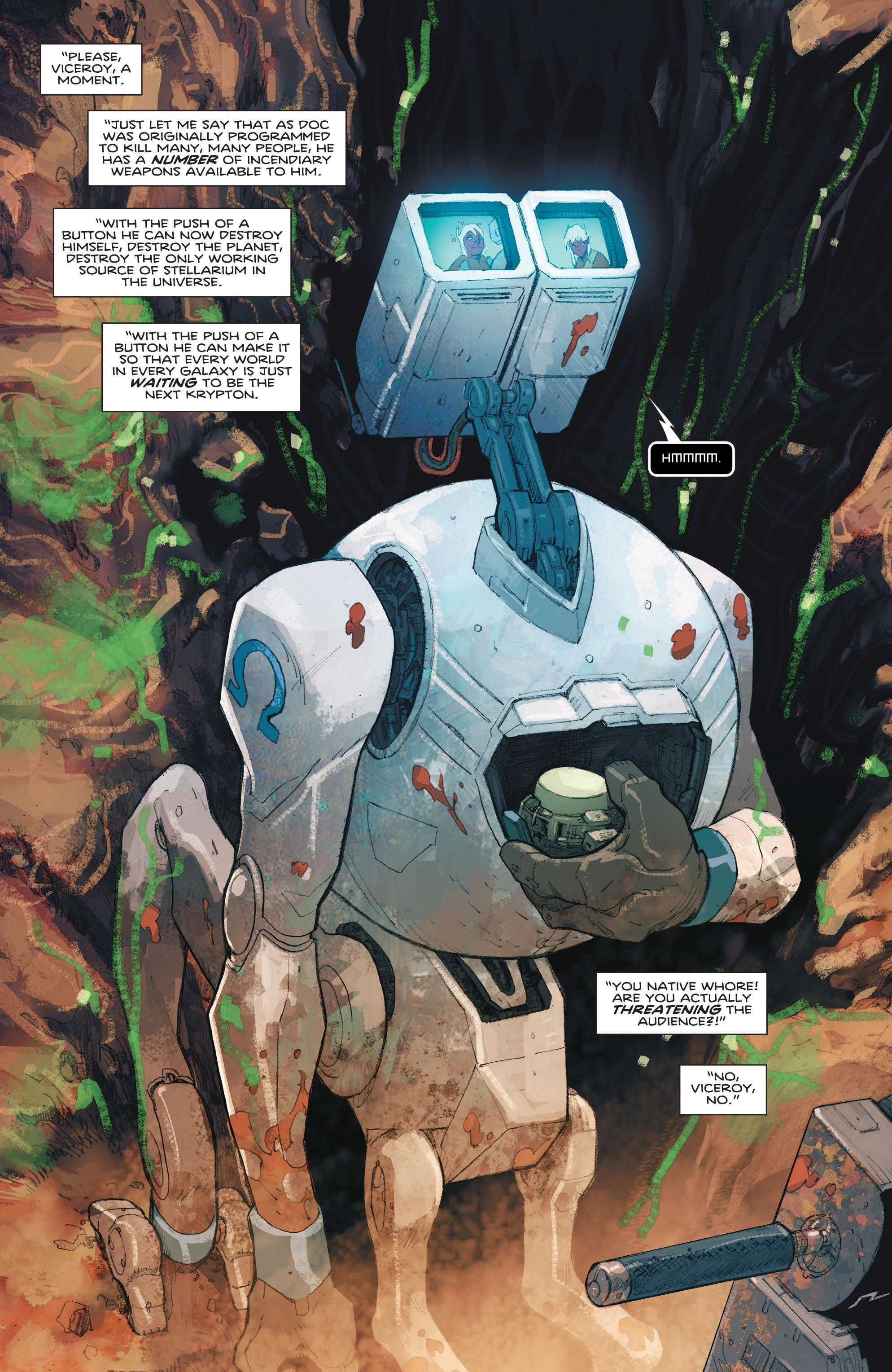 Doc was part of an army of robots sent by the Citadel to kill all the people of Voorl. The Citadel wanted to use Voorl's stellarium to stabilize other planets in the system. Voorl was a shielded planet and the Citadel was able to accomplish their genocide without the universe being aware. Following this, Doc's orders were changed to bury the population and care for them as he would his family. At this point, he discovered a young child, Scrapps, the only survivor on Voorl.[1] The pair later joined the Omega Men in an effort to free the Vega system from the Citadel's control. He sacrificed himself to destroy Voorl and end the Citadel's production of stellarium.[2]