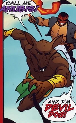 Devil Dog and Anubis were involved in a title fight for right to claim the legacy of Hellhound. Blue Beetle interrupted the fight and sarcastically suggested they take different names. They seized upon the idea, taking his names, and joined together as the Dogpound to face him.[1] After this, the villains remained together as small-time criminals and even added another dog-themed villain, Junkyard Dog, to the team.[2]
