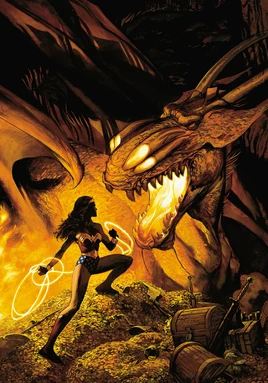 In the 14th Century, Drakul Karfang and her Drakunomes were defeated and she was driven into the Alps. After sleeping for six centuries, it awoke near Altdorf and unleashed her terror in search of gold. Wonder Woman quelled the initial attack, but learned from the Oracle of Delphi that it would take the Justice League to destroy their foe - but they would be destroyed in the process. Not wanting to take the risk, Wonder Woman incapacitated her teammates and took on the dragon herself. The dragon was a creature of lies, and as such the opposite of the Goddess of Truth. Nevertheless, it required trickery to defeat Drakul Kargang. Wonder Woman promised to protect the dragon's heart if she surrendered. The dragon refused, but in doing so was tricked into revealing the location of her heart. In a long and arduous battle, Wonder Woman defeated the dragon with help from some renegade Drakunomes and Superman, who arrived just in time to save Diana from drowning after the dragon had been killed.[1]