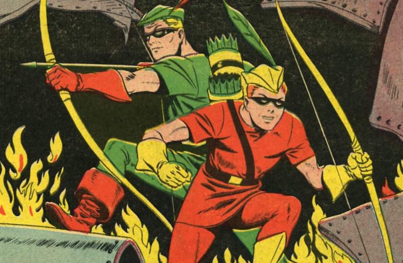 Shifted in time after facing Nebula Man, Earth-Two Green Arrow poses as Robin Hood, before he is rescued by Hawkman, Dr. Midnite and Wonder Woman. [14]