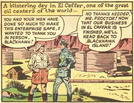 In the late 1940s, El Caffar was one of the world's great oil centers, and crude oil was pumped there from all over the Near East for transshipment and storage. In 1949, an arsonist/racketeer called "Moloch" tried to extort money from the oil company, and destroyed several big oil tanks in the process. The celebrated Blackhawk Squadron was already in El Caffar when this happened, and the fire bug, who called himself "Mr. Moloch," was arrested, along with his gang.