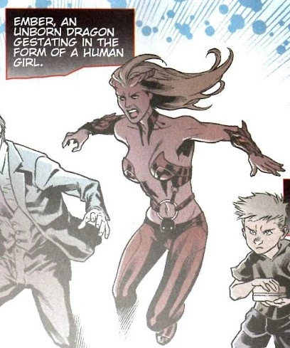 Ember is an unborn dragon gestating in the form of a human girl, hired by Brother Night and seemingly in a sexual relationship with him.