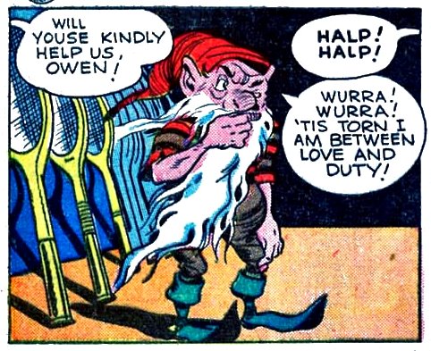 He was caught by a airplane when he was sleeping on the top of a tree. Coming in Gotham City, he was captured by a supertitious crook nicknamed "Super" Slade. Slade forced Owen, according with the very magic laws, to serve him. This was reflected in committing crimes. This caught the attention of Green Lantern and Doiby Dickles. Since Doiby looked a lot like his father, Rury, Owen thought the taxi driver was his uncle. The heroic duo was able to free the leprechaun, but as Owen always teasingly threatened to reveal the secret identity of Green Lantern, the Emerald Knight was forced to freeze the tiny magical being in his fireplace. He returned to mobility when his name was broadcast on the radio, and many children began to believe in his existence.