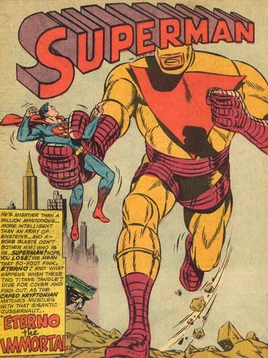 However, Eterno wanted to rule the Earth itself, and during his battle with Superman, it turned on the Revenge Squad and fired upon their starship with his Destructo-Beams. In a panic, the Superman Revenge Squad blasted the robot with Absorbium bullets, and the Immortal half-android/half-robot was deactivated -- falling on the starship and killing the revenge squad.
