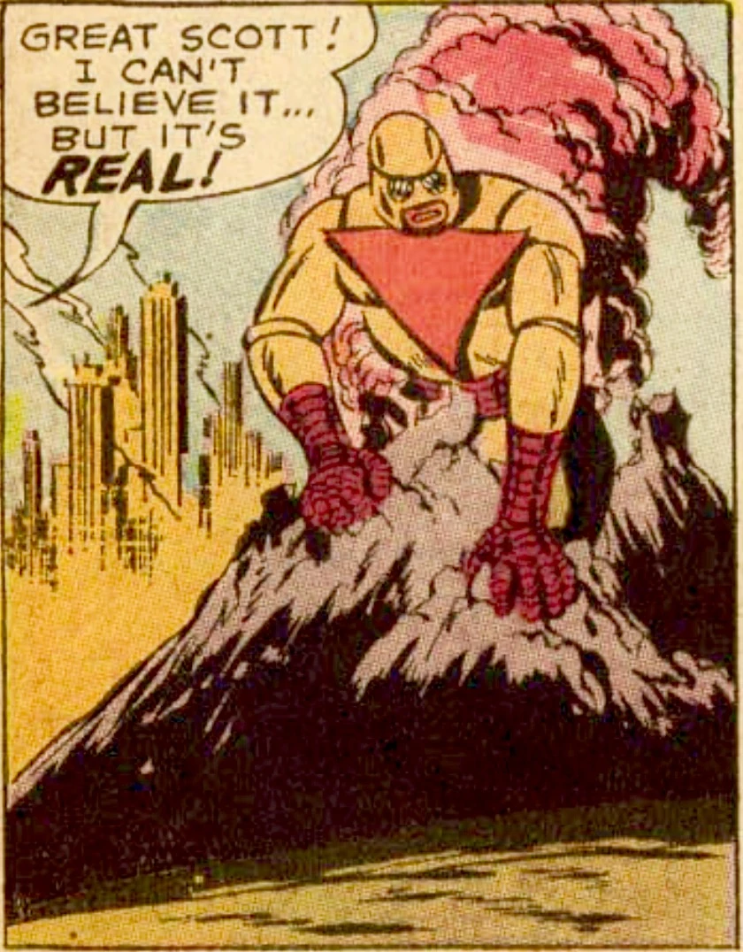 It was built as half android and half robot and encased in indestructible Sunthoflesh. With the advantage of super-science, Eterno was able to harness the energy of the stars and cast Destructo-Beams far and wide. He was said to be "Mightier than a million mastodon... more intelligent than an army of Einsteins... and H-bomb blasts don't bother" it.[1]