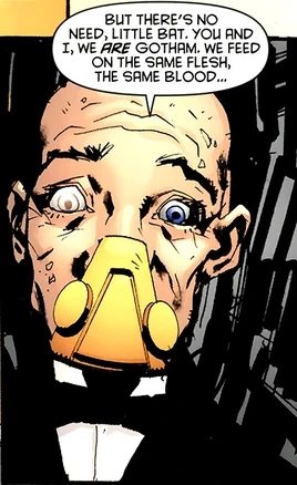 Guiborg first attracts Batman's attention when his sold weapons are involved in a series of murders across Gotham City.[1] Batman disguises himself as a member of the Dealer's dark cult and infiltrates Mirror House, where everyone is required to wear a gas mask. The Dealer immediately exposes him with a sabotaged mask and drugs Batman with hallucinogenic nerve gas.[2] The entire house are commanded to tear Batman apart, and he barely escapes through the violent hallucinations. Batman ambushes the Dealer again on a flight leaving Gotham. He ingests Man-Bat serum to turn himself into a monster, but Batman still beats the crap out of him and the plane goes down during their fight. There's a massive explosion, but the Dealer's body isn't found in the wreckage and he might have escaped.[3] It's later revealed that he was assisted in his Gotham plans by James Gordon, Jr..[4]