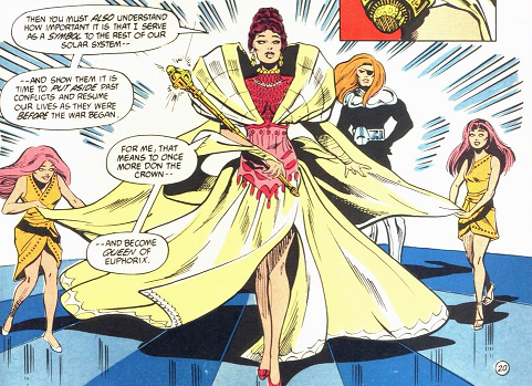 During the Citadel War, Kalista relinquished the throne so that she could serve in the rebellion against the Citadel as a member of the Omega Men. Scientist and statesman Alonzo Dulak assumed control of Euphorix during Kalista's absence. When the war was over, Kalista returned to Euphorix and resumed her role as the planet's queen. During the post-war celebrations, she decreed that the planetary shield was to be deactivated, but less than a week following the war, the Euphorians found themselves the target of Citadel invaders. Kalista and the Omega Men repelled the invaders, but the raid prompted Kalista to reverse her decree and she ordered the shield to be re-activated permanently.[2]
