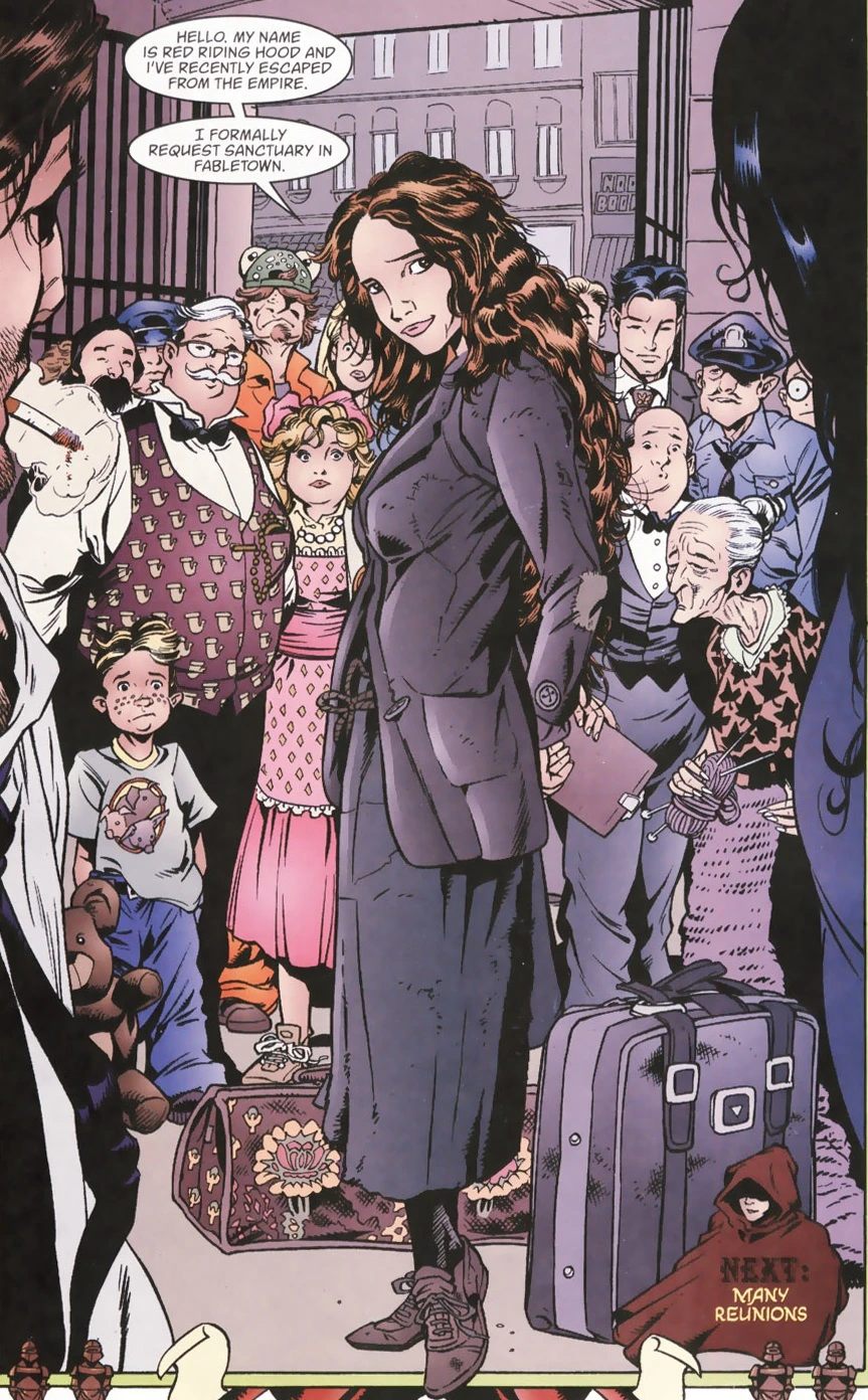 After opening the front door of the building, they are greeted by a young red-haired woman. She introduces herself as Red Riding Hood, claiming she just recently escaped the Adversary, and is seeking asylum in Fabletown...