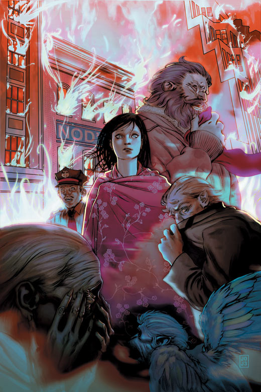 The rest of the Fables fight with fire-hoses to try and put out the flaming soldiers. The battle seems to be lost. Then, a gust of wind starts to pick up, getting stronger and stronger until it becomes like a small hurricane, blowing the flames out and sending the soldiers away into a heap of broken parts. The Fables come out from cover as the wind dies back down again. Bigby Wolf, in his giant wolf form, greets them.