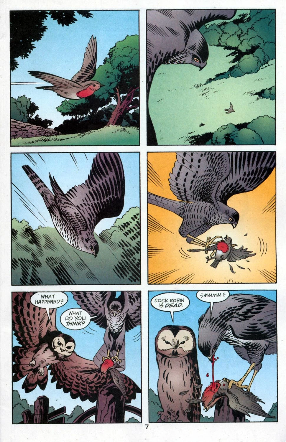 Cock Robin is flying into the Farmlands when he is ambushed by an owl and killed. This alerts Boy Blue back at the Woodland building, who had a charm placed on Cock Robin earlier after the Forsworn Knight's prophecy. He rushes to Bigby's office to tell him that Cock Robin's been killed while delivering a message. Combined with the phones being out, Bigby is convinced something rotten is going on and vows to help Boy Blue round up a posse, since he himself is forbidden from entering the Farm.