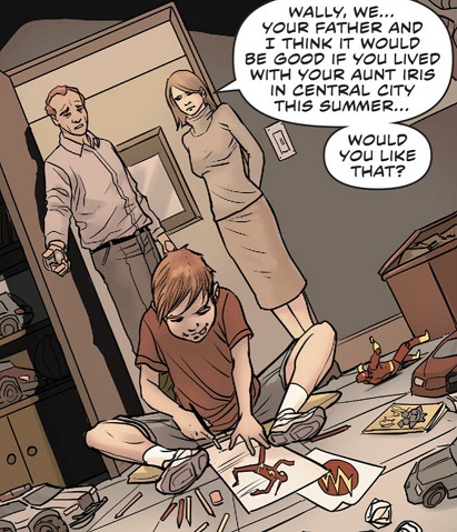 While corrupted, Barry, in a fit of rage, revealed to Kid Flash that Daniel West was, in fact, his father, rather than his uncle as he was led to believe. Kid Flash ran away, angered at how he was lied to his whole life. Wally later found his cousin and comforted him, offering advice and words of wisdom.[6]