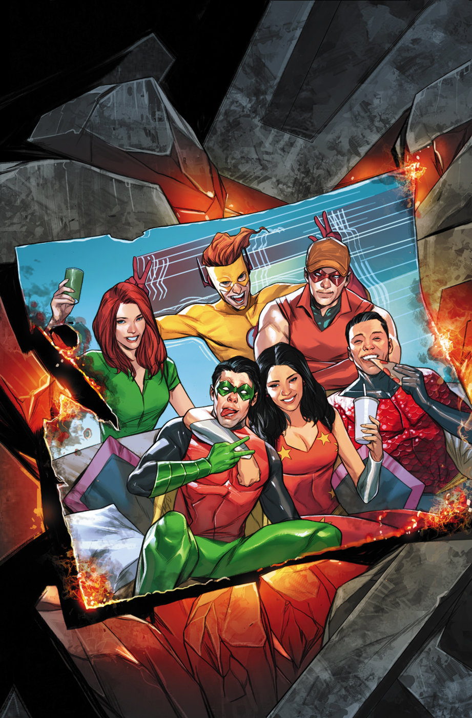 After making himself a new costume, Wally went to find his friends - the original Teen Titans. Restoring their memorizes of him with shocks of his electricity, these heroes reformed their childhood team under the new name "the Titans".[4] [5]