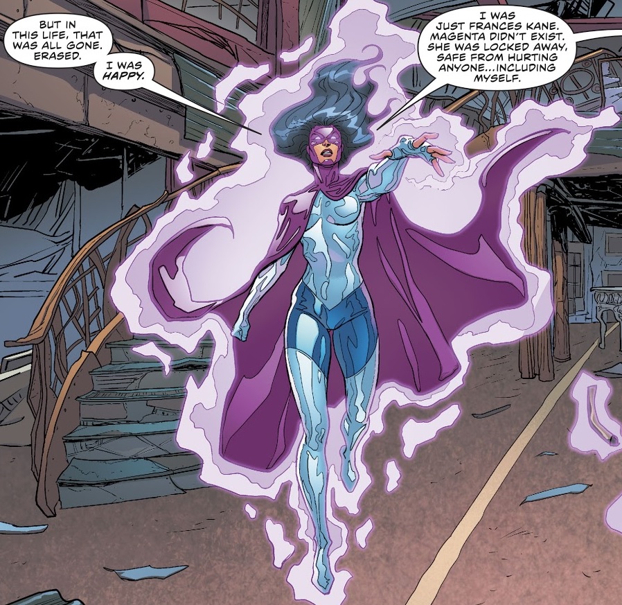 Frances was the victim of Abra Kadabra's machinations, forgetting her past history with Wally. She had no memory of him when he approached her with questions, but their proximity caused her to suddenly and violently remember. She briefly fought him as Magenta, but Flash was able to subdue her and the two made peace recollecting their memories together.