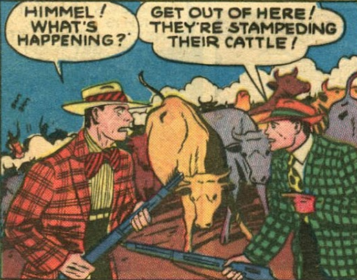 When Fumpf and Schultz arrived in America they were met and guided by Larry Atwater who helped them in their plan to slaughter cattle and destroy the meat supply. The news of the crimes caught the attention of Quicksilver. The group of men tied a woman down and left her to die, and Larry Atwater shot Tex Talbot. Quicksilver saved the woman and discovered that it was Larry Atwater who shot Tex Talbot. After getting a confession from Atwater Quicksilver went to Saunder's Ranch to stop Fumpf and Schultz. A group of men shot into the air, causing the cattle to stampede into the men which killed them instantly. Hans was impaled on a horn and Himmel was crushed.