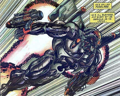 Fuselage quickly flew to Dakota and blasted his way into the office of a shocked Stuart.[1] Uncertain of which file to steal, the cyborg mercenary ordered Stuart to copy all of Hard Company's computer files onto a disc. Stuart used this opportunity to stall for time until help could arrive. Learning of the break in, Hard Company's enforcer, Hardware, surprised Fuselage by smashing through Stuart's office window and taking them both back outside.[1] Fuselage then engaged in a fierce aerial dogfight with Hardware, who soon realized he was outmatched. So, Hardware changed tactics by retreating and weaving between Dakota's buildings to evade Fuselage, who was now determined to kill his foe, viewing him as the final obstacle to reclaiming his humanity.