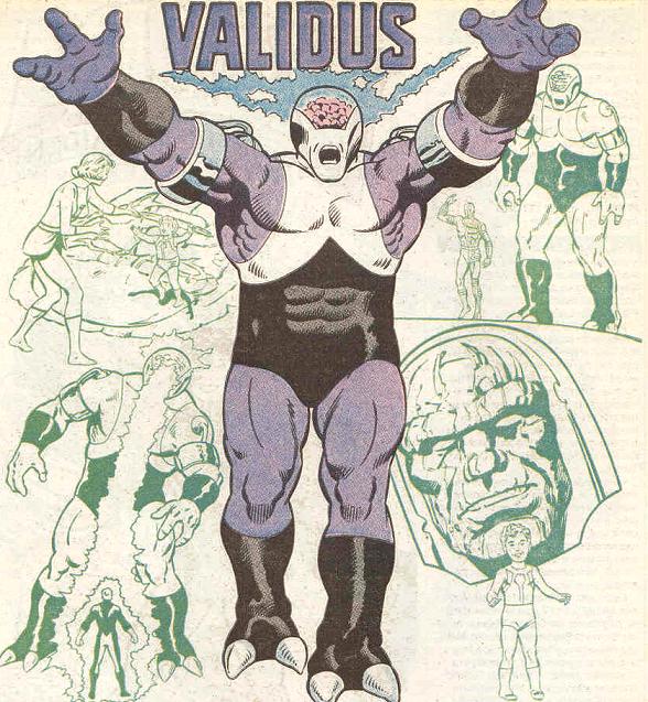 In the late 30th century, the Legion of Super-Heroes members Lightning Lad and Saturn Girl gave birth to twin children. Following an epic event known as the Great Darkness Saga, the New God known as Darkseid kidnapped Garridan Ranzz at the instant of his birth. He then sent the newborn backwards in time ten years, cursed with a monstrous body and practically mindless.[1] His child-like persona made Validus extremely susceptible to persuasion - a handicap that Fatal Five member Tharok took advantage of at every given opportunity. It was Darkseid's plan that the mutated child would one day grow up and kill his own parents.