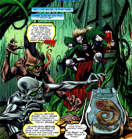 When Abnegazar was killed during the attack of the Great Darkness, Ghast and Rath were the only remaining of the Demons Three.[1] Seeking a third demon, Ghast and Rath found Wotan, stranded in Limbo. They assisted the demon in his plan of stealing the body of a Homo Magi to return to Earth and join them as the third demon.[2] Ghast and Rath were in charge of retrieving the limbs of Zatanna and assemble the body piece by piece, preparing Wotan's comeback. However, their plan was foiled by Spectre and Ghast and Rath were taken to Limbo, where they were left estranged.[3]