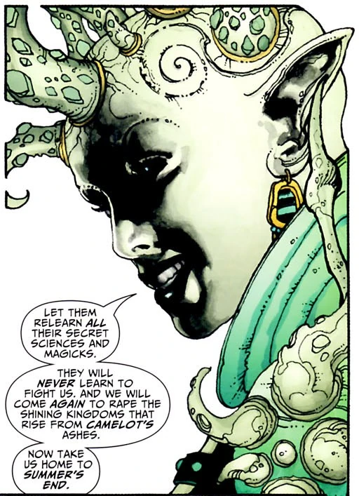 She usurped leadership from her husband and former king Melmoth and led an invasion of the past to harvest it's history, only to be slain by the Seven Soldiers of Victory.