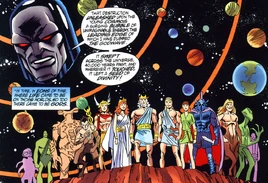 The wave of power swept across the cosmos, leaving a seed of divinity wherever it touched, and became responsible for creating various pantheons of gods and divine entities on various planets. As the energy wave spread, it eventually reached the edge of the universe and rebounded, making a second pass that created the potential for superhumans on planets such as Earth a thousand years from the present. In time, the resonance created by the Godwave began to expand and contract whereupon it returned to the Source. This expansion and contraction began to affect the powers of various beings throughout the universe. As a result, the cosmic energy force began to tear apart the structures it had created; whereupon it would wipe the universe clean to bring about the emergence of a new and terrible Fifth World to replace it.