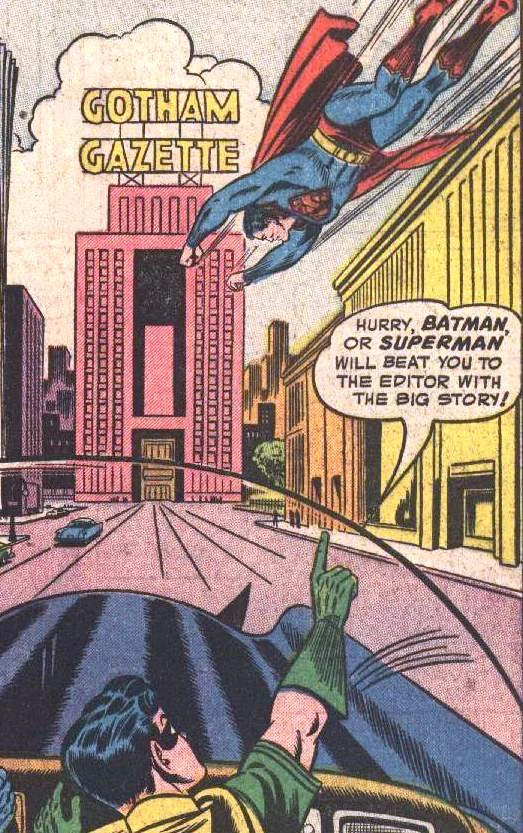 The editor of the Gotham Gazette usually printed stories featuring the local heroes Batman and Robin, but after a few years, he started to focus more on the Dynamic Duo's arsenal against crime. For this reason, the Gazette printed several stories about the Batmobile, the Batplane and the Bat-Signal.[4]
