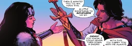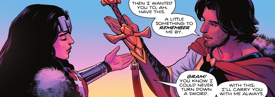 When he first met Diana of Themyscira in the Norse afterlife in Asgard he gifted her with Gram so that she would have better chances in the eternal battles of the Slain Warriors of Valhalla.[1]