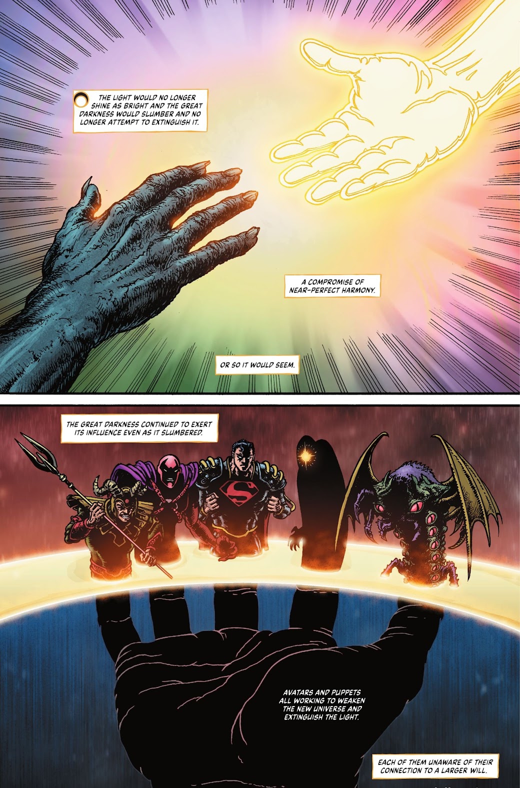 - Reality Alteration: The "territory" that is the Great Darkness constantly fluctuates and reshapes reality.[22] A sliver of the Great Darkness' power allowed Pariah to forcibly imprison the Justice League in pocket dimensions created from their inner desires,[24] and caused untold cosmic calamities across the Omniverse during the Dark Crisis.[25]