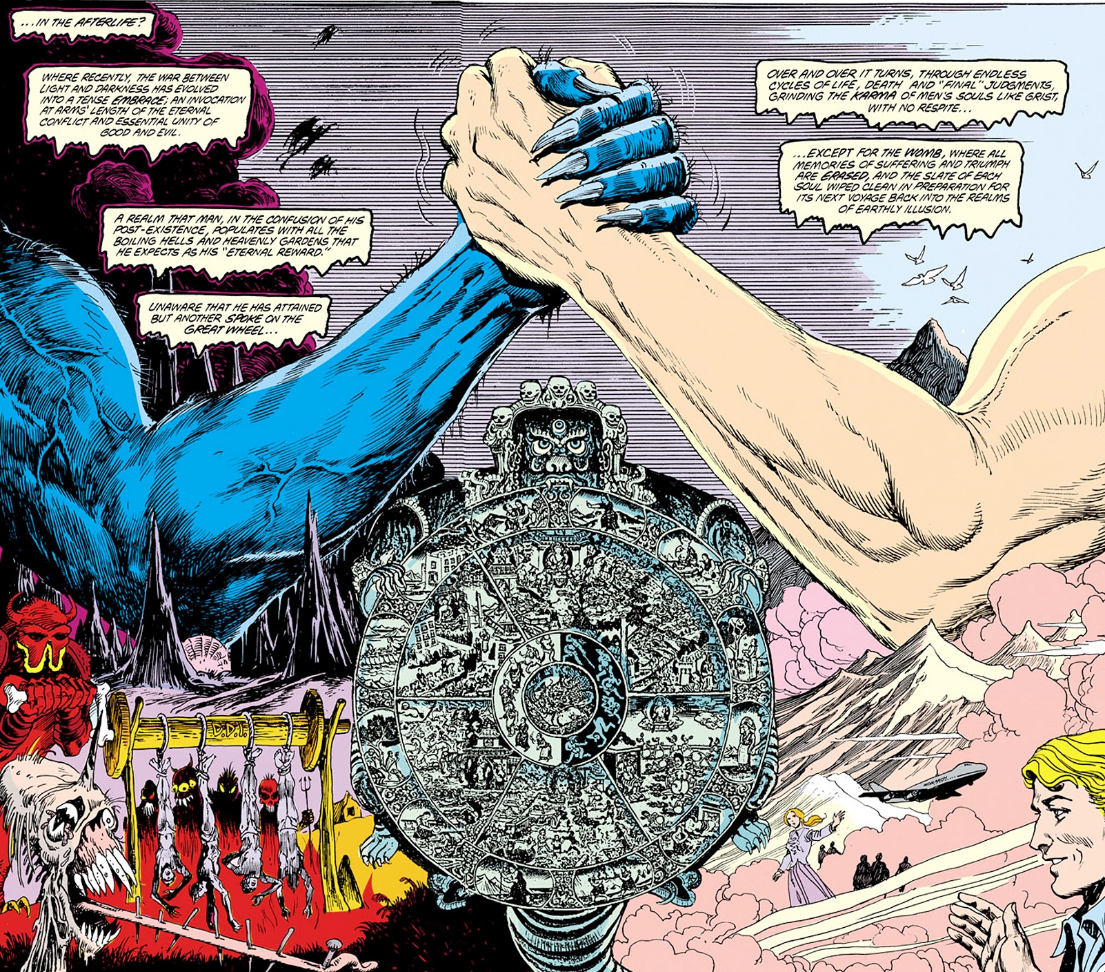 The Primordial Darkness soon gained consciousness. Several heroes tried to battle it, but they were easily defeated and drawn into its almost infinite being. The encounters taught the Darkness a great deal. Etrigan told the Darkness that it was Evil, Dr. Fate explained that Evil was despicable, and the Spectre taught it revenge. All the encounters only served to further strengthen the Darkness and point its aggression towards Heaven. Finally, Swamp Thing entered the Darkness, and tried to explain his theory of evil—that good and evil define each other and that one cannot exist without its counterpart. The Darkness then reached its hand towards Heaven, and to the surprise of everyone, the Light reached out His hand as well. The two of them embraced. The world was never the same again. Good and Evil would still exist, but Light and Dark would remain locked in a truce, a truce supposedly contingent on the multiverse remaining limited to a single world.[1]