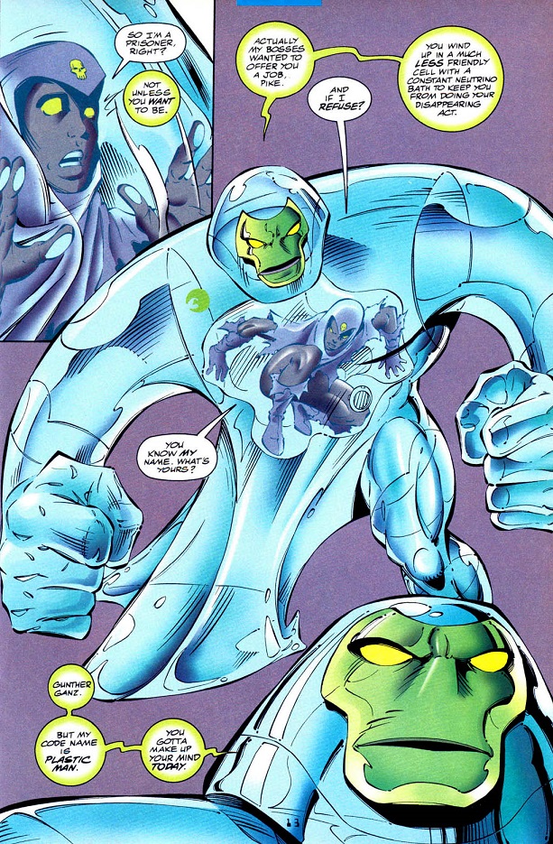 Plastic Man survived Harvey Dent's mental attacks on his "living polymer" form which can temporarily assume external shapes in response to Ganz's mental commands. Nevertheless he was willing to help his allies in opposing Dent though suggested to be in the eventuality to be able to exact some sort of personal revenge on Dent for Dent killing his original body rather than for the benefit of the populace of Earth-9.