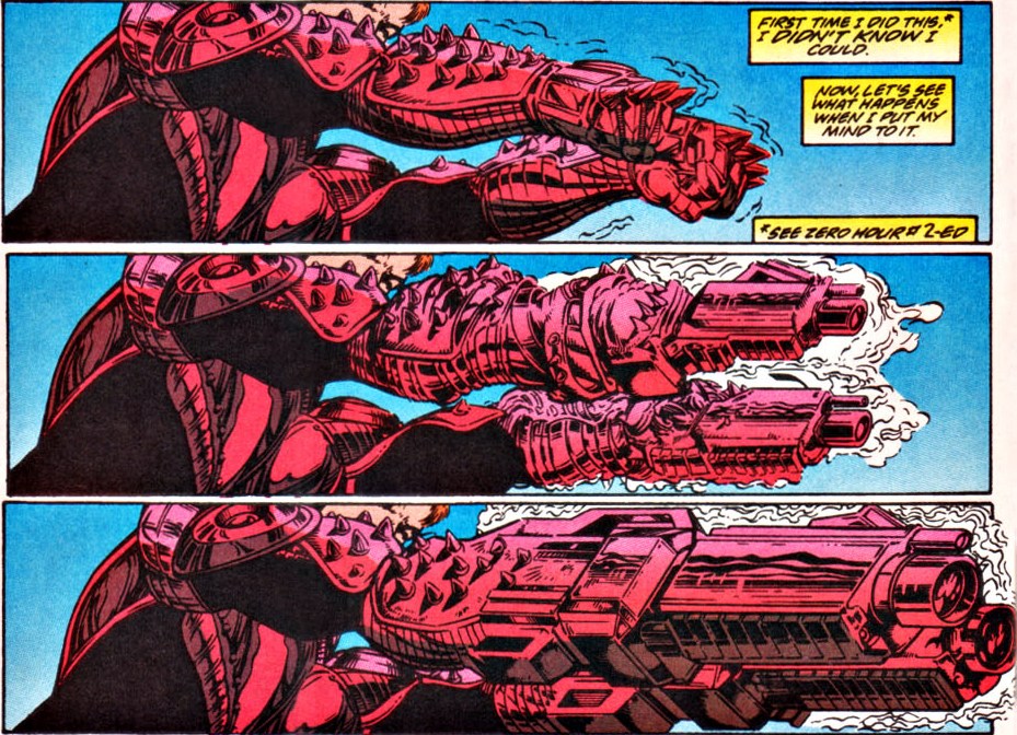 Guy offered to lead the group but was immediately turned down. This was also his first meeting with Kyle Rayner. He saw the potential in the Crisis to undo the atrocities Hal had committed and bring the Corps back.[77] Requiring additional firepower, he was shocked to find that the new armor his body was covered in could also generate weapons based on his thought commands.[78] Flung through time along with Steel, Batgirl and Supergirl, he went on an odyssey through history before returning to the present. Through the years, they met Anthro, the Rough Bunch, Space Ranger and the Blackhawk Squadron. Another trip took him to one of his earlier dates with Kari Limbo, although having an identical self in the same time period made his armor go haywire. He was also taken to the day Coast City was destroyed, and watched the love of his life Kari die before his very eyes.[79] Fissures widened, and Guy was one of the handful of heroes in the last pocket of reality when Parallax actually revealed himself.[80] Clearly the most vocal against Jordan's attempted reformation of the universe, Guy was tempted by promises of a better world, but ultimately refused the idea that something good could come of cosmic genocide. Green Arrow shot Parallax and ended his campaign, then the entire universe was naturally rebooted at the Big Bang by the Spectre. Taken back to the regular world by Waverider, he discovered in the battle his armor had been lost and was replaced with strange skin patterns that seemed to manifest the same abilities.[81]