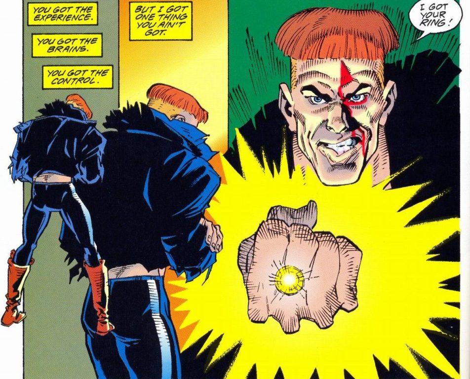 After Hal Jordan returned to Earth from a lengthy stay in outer space, he attempted to persuade Guy to allow him to have his sector back. An overly confident Guy refused to listen to reason, and instead insisted that they make the decision in a single no-holds-barred fight in the streets of New York, without their rings. Gardner lost to Jordan in a punch-out, and was forced to give up his ring and quit the Corps.[47] He would go out in search of a new weapon.