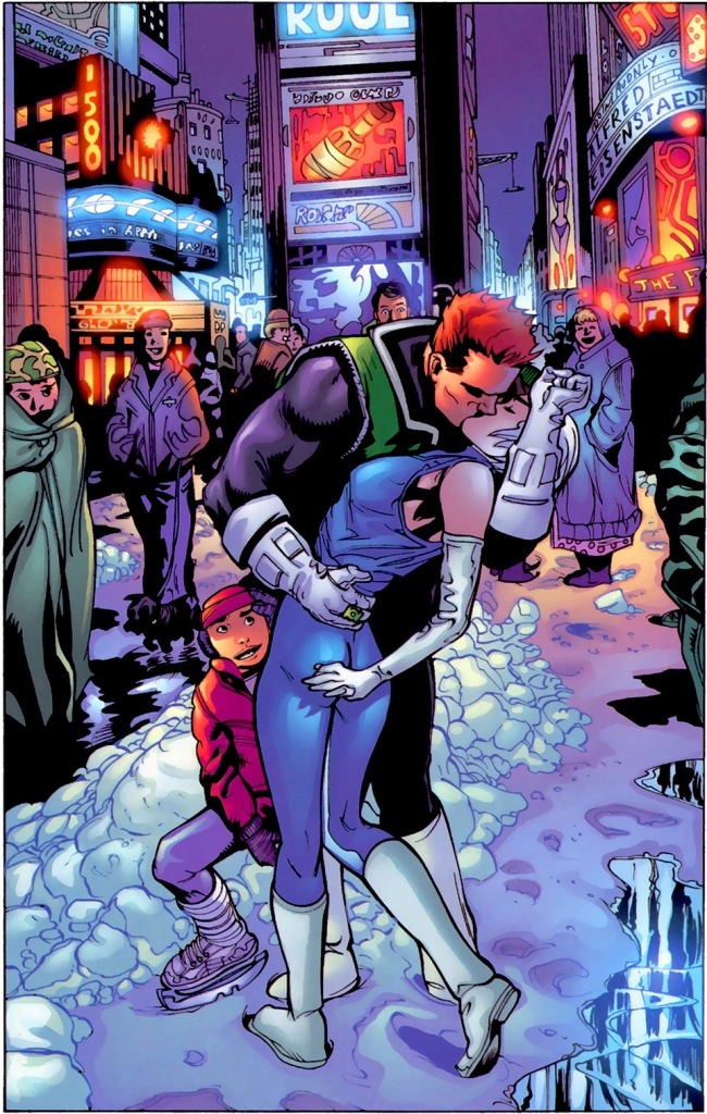Guy refused to believe he could never be a hero again, and was not deterred by losing his powers. Instead, he went through a number of efforts to reinvent himself. He tried to clean up all of the crime surrounding Times Square using nothing but his fists and his machismo. After getting beaten up by Black Hand and his crew, he realized he would need a new gimmick. At first, he visited the New Guardians, although he was kicked off their island by Gloss for flirting with her. He then tried to become a gun-toting anti-hero with an overly large amount of guns, but gave that up when malfunctioning weaponry forced him to flee from a fight with Goldface.