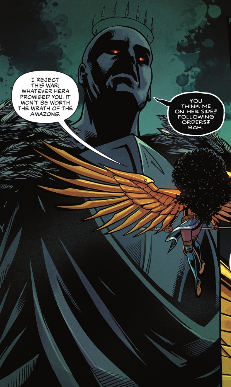 In a series of false memories his brother Zeus had implanted in Wonder Woman's mind, Hades attempted to force the Amazon to marry him, and was later killed by the First Born.