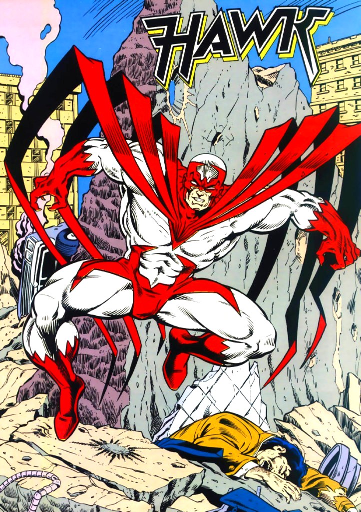 Hawk is a legacy name used by several superheroes acting as the avatar of war, partnered with Dove as Hawk and Dove. The original Hawk was Hank Hall, partner to Don Hall. Following his brother's death he partnered with Dawn Granger until he turned evil and became Monarch. Sasha Martens used the alias while partnered with Wiley Wolverman. Holly Granger became the third Hawk alongside her sister, although Hank returned following Holly's death. The name has been associated with membership in the Birds of Prey and the Teen Titans. Hawk was created by Steve Ditko and Steve Skeates, first appearing in Showcase #75. (1968)