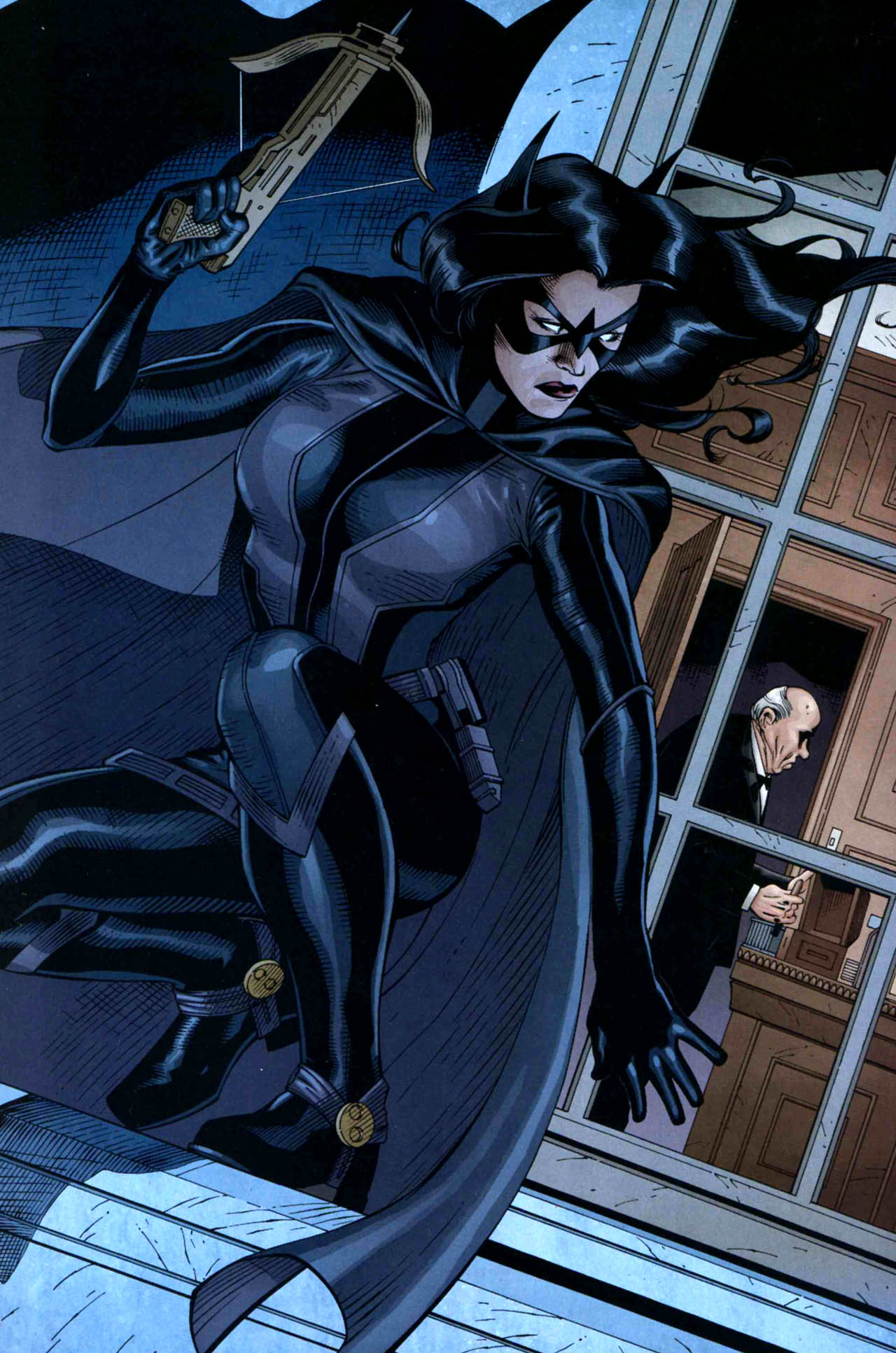 When Black Canary was kidnapped by blackmailers Savant and Creote in a scheme to learn Batman's identity, Oracle requested Huntres' help. Huntress first tracked down an abducted baby and saved from her kidnappers,[128] before racing to Canary's location. She took down Creote, after a long, hard fight, and pinned Savant's hand to a wall, then helped an injured Canary to her feet, so she could knock out Savant herself. She apprehended both criminals and brought Canary to safety, as Oracle stole Savants' files.[129][130] Senator Bob Pullman soon asked for a chat with Black Canary and Helena impersonated her injured friend as a favor. Pullman, a former client of Savant, threatened "Canary" to release Savants' files to which she refused.[131] When Pullman's private muscle chased after Helena, she defeated them with Dinah's help.[132]