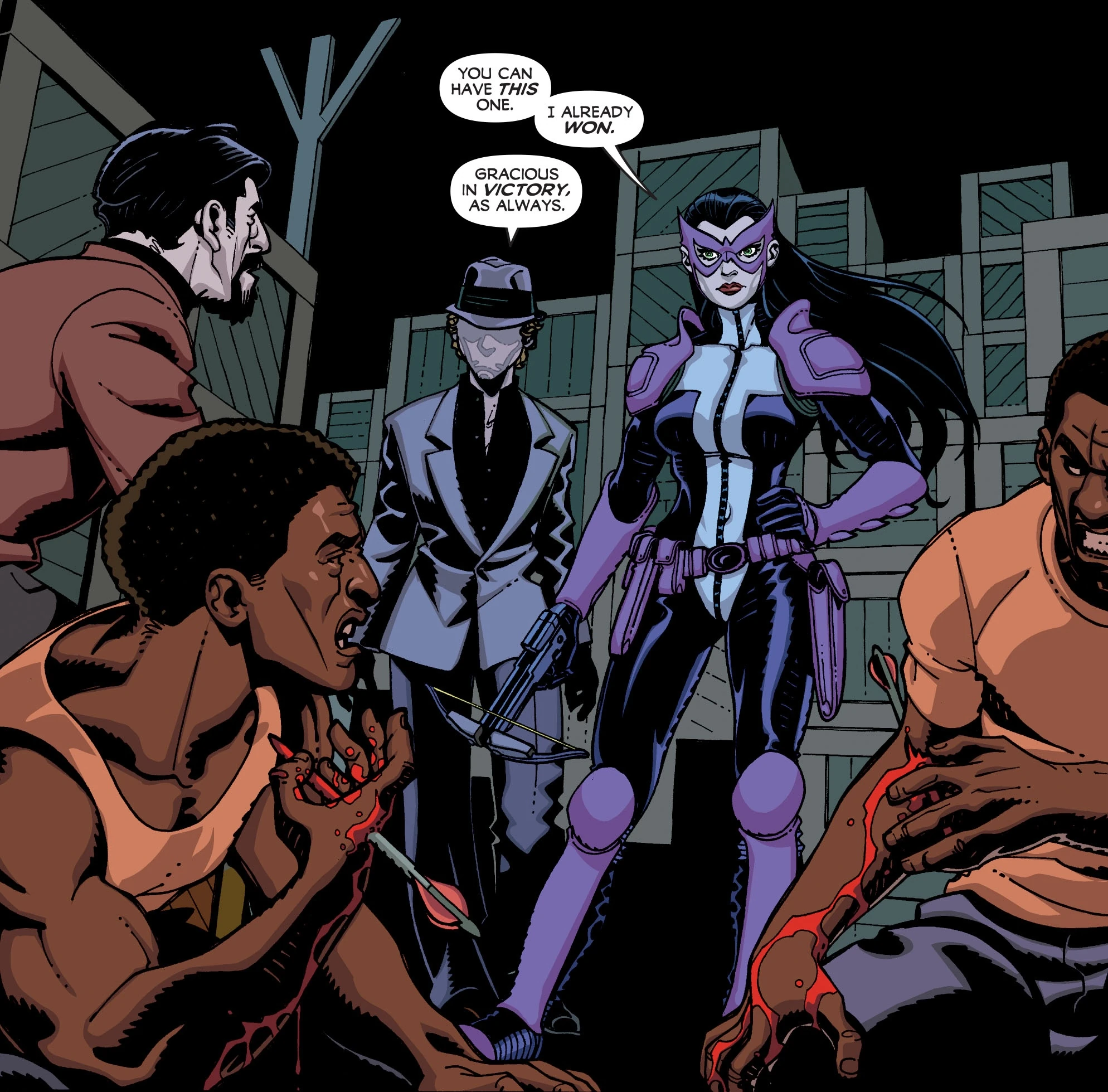 Huntress stalked and swiftly took down National Guardsmen who were raiding a medical vans bound for a triage tent. The Question helped her transport the supplies and revealed that corrupt National Guardsmen had been hijacking medical supplies to sell them off in Hub City. Working together, the pair learned that Lt. Alex Kofey headed the scheme and subdued Kofey and his men. Huntress fired a spike just past the bound Kofey's head and, although she expected Question to press her on why she did it, he instead suggested that the right question to ask is why she did not kill Kofey.[58]