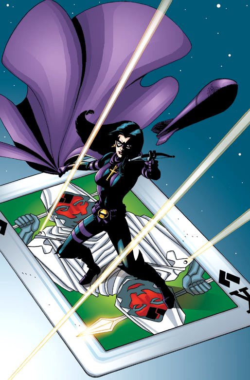 Confronting Boss Cassamento, Huntress learned that she is not the biological daughter of Franco Bertinelli but of Santo Cassamento. Deducing that Cassamento had figured out her secret identity, Helena also pieced together that he had been the one framing her. Cassamento explained that, on Mandragora's orders, he arranged her family's assassination but with an amended instruction to "spare the sister", referring to her mother, Tomasso's sister, but that Helena was spared instead. Cassamento then made Huntress an offer she could not refuse; he promised to keep her identity a secret on the condition that she would act as his enforcer. Cassamento knew that publicizing Huntress' identity would likely forfeit her life and that she could not kill him as that would again make her a target of Batman and the police. Backed into a corner, Helena attended her cousin Monica Panessa's wedding with Vic Sage, deciding to play on an old Sicilian tradition; that a father cannot refuse an offer on the day of his daughter's wedding. Helena told Tomasso that Cassamento was responsible for killing his sister and son, and asked him to kill Cassamento for revenge. After spending a night together, Huntress and Question ambushed Mario Cassamento, forcing him to flee Gotham. The next night, Helena lured Santo Cassamento to the docks, where he was killed by Tomasso Panessa, who in turn was caught in the act by the police, following an anonymous tip by Helena. Helena had debilitated the Cassamento and Panessa Families but Question broke off his partnership and romance with Helena over her methods. "Damn you", he told her but she replied "Happened long ago, Vic". With her family avenged, Helena resolved that enough blood had been spilled and she threw her cross into the Gotham harbour.[109]