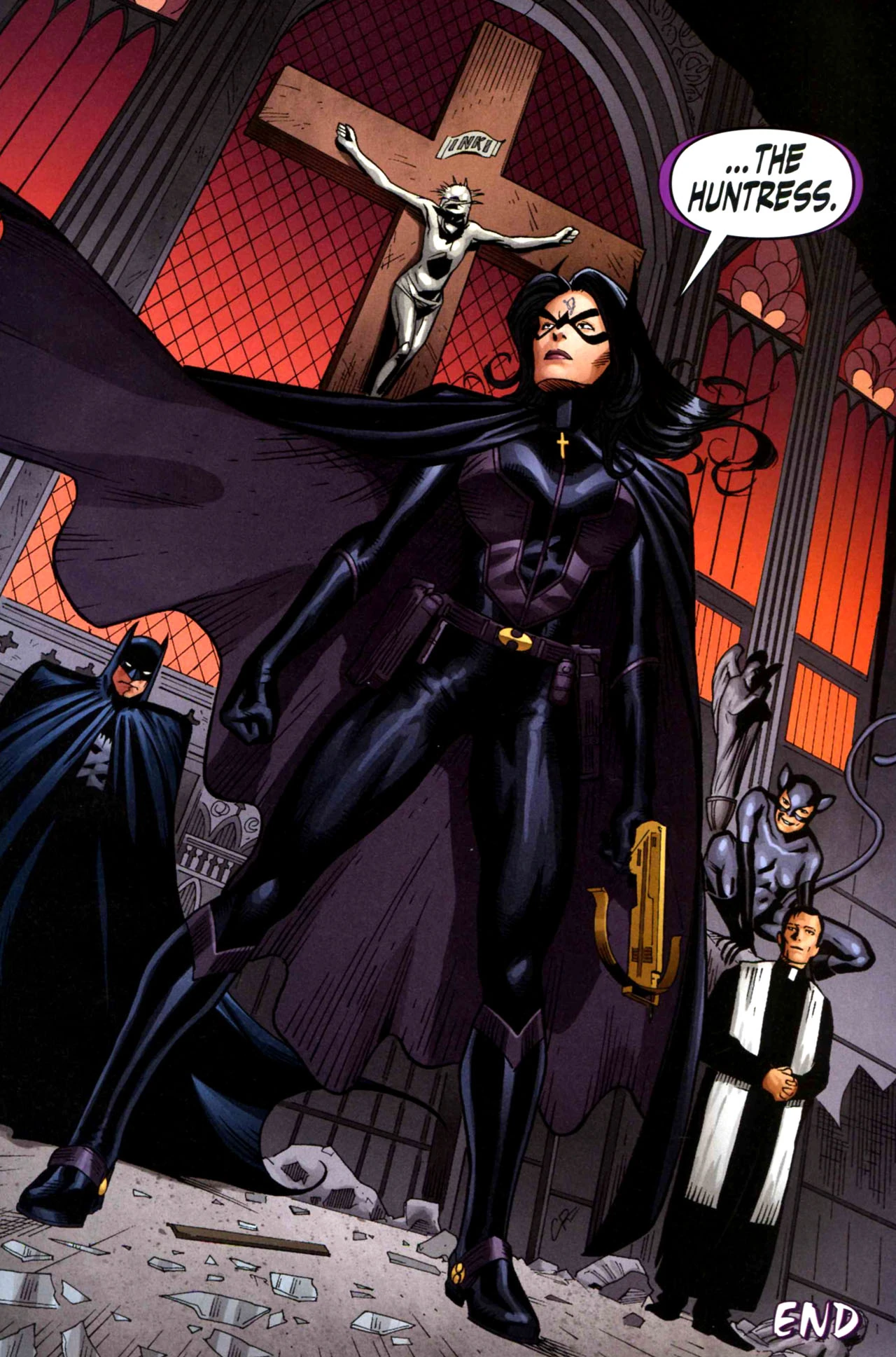 Tracking Omertá back to Gotham, Helena uncovered a mafia conspiracy involving Nino Angelo, Gotham's mayor and billionaire Bruce Wayne. Unaware that Wayne was actually staging a sting, Helena attacked and interrogated him, and easily subdued Batgirl when she came to Wayne's defence. Looking for answers, Helena confronted Nino Angelo and witnessed his assassination at the hands of Omertá. Mistaken for Nino's killer, Helena fought off Tony and clashed with the Batman, escaping with the guidance of Catwoman, who applauded Helena's independence. Investigating the mayor, Helena discovered the conspiracy involved blowing up an east-side levee to flood Gotham, after which the mayor would use disaster to look like a hero in a bid for presidency while the mafia's construction business profited off the rebuild.[18] Deducing that "The Pope" had Nino killed for his over-ambition, Helena asked him to help her foil the Angelos' plans. Extrapolating that the explosives were hidden under her abandoned old home, Helena ambushed Omertá, sent by "The Pope" to stop Tony and later ordered to execute Helena. Finally defeating her family's killer, Helena opted to cut off his tongue instead of killing him. Rejecting Batman's authority and moral rigidity, and Catwoman's self-serving bent, Helena declared herself the "first of something else" and baptized herself as "The Huntress".[19]