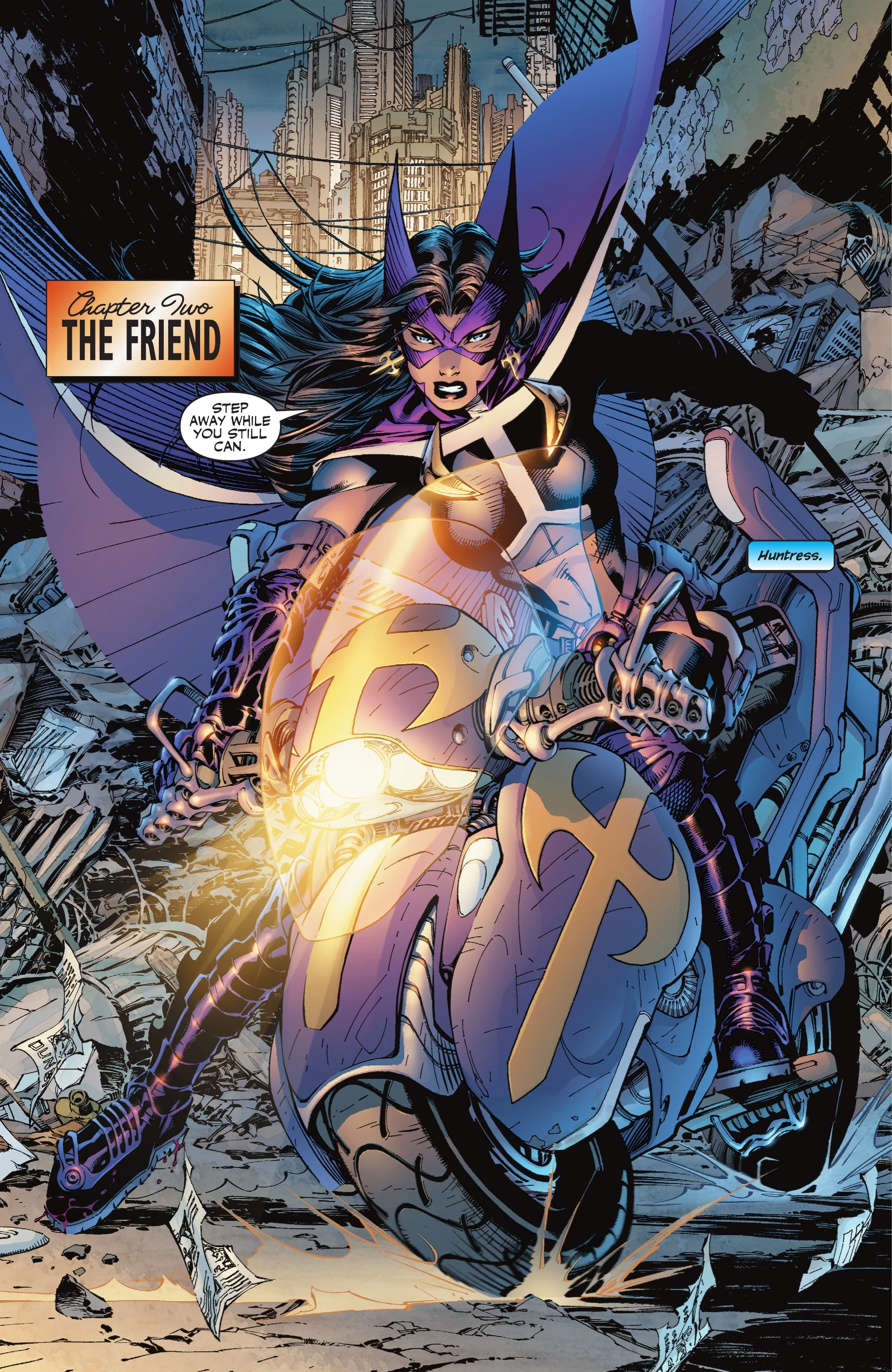 Fearing that Oracle was manipulating her just like Batman and feeling guilt over her past, Huntress abruptly left the group and returned to Gotham. Using Creote and Savant as backup, she gave an offer to the Mafia saying she wanted in and would eliminate the compettition. Barely accepted, she set her plan by setting the mobs against each other. In truth she was gathering information on the mob for Batman to use. Batman confronted her but was pleasantly surprised when Huntress handed her "atlas" to him.