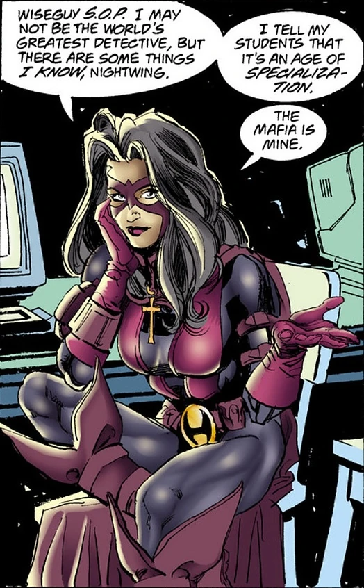 Ostracised because of her mafia ties and following the Maxi Trials closely, Helena realized that everything she had been told about the Mafia by the Asaros was a lie; that the Mafia was a force of crime and violence, that Sal and her Uncle Nicola were in fact hitmen and that her own family had been at the top of the mafia's operations in Gotham City. At age sixteen, she finally returned to Gotham City to spend Christmas with the Five Families, whom Batman would pay a visit. Inspired by the way Batman intimidated and fought the people she despised, Helena vowed to following his example.[11] Helena began plotting her vengeance and after finishing school, she enrolled at the university in Palermo, where she learned all could about organized crime and La Cosa Nostra.[12] Helena also felt bound to Omertà, not just a Mafia code of silence but a Sicilian code of honor born out of a distrust in the state following 2,000 years of invasions and occupations; the idea that one has to take it upon themselves to see justice served and honor restored.[13]