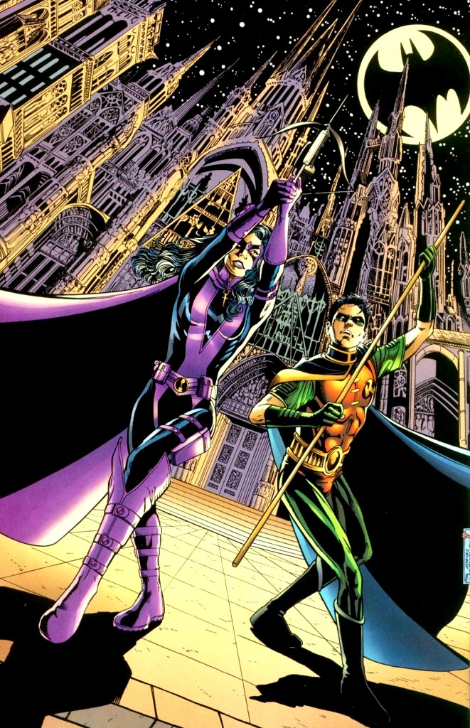 Huntress and Robin were on the scene when the Trigger Twins and their "long lost sister" Tonya stole priceless computer chips and had the Bandidos bike band blow up a bridge to create a massive gridlock. Huntress and Robin tailed the Triggers on horseback, and although they escaped, Huntress deduced that they were operating out of the "Gotham Gulch". With the rising sun in their eyes, the duo, along with Nighthawk, Cissy Chambers, Pow-Wow Smith and Shotgun Smith, had a Western-style standoff with the Triggers and Bandidos. Although outnumbered, the vigilantes won the day by using mirrors to reflect the rising sun back at the Triggers and Bandidos. Tired but gleeful, Huntress and Robin rode off together into the sun.[47]