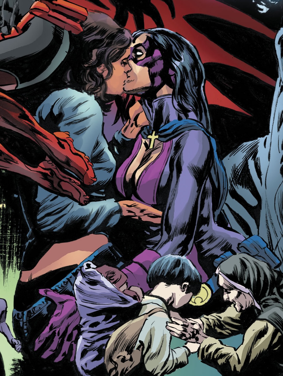 In the catacombs under an opera house, a masked Helena found mafioso Stefano Mandragora, the boss of bosses worldwide, dividing up her inheritance with other powerful and corrupt individuals, with one "making their bones" on a kidnapped woman. Helena subdued the criminals, took her inheritance and saved the woman. Soon after, Helena reunited with an escaped Sal Asaro, now a priest, who revealed to her that it was Mandragora who ordered the death of her family.[16] Helena then began her crusade of vengeance; constructing a costume and assassinating Mandragora in his home. At a bar, Helena overheard a group of American lawyers toasting Mandragora's death and she warned them it was naive to think that death solves anything. "The Pope", knowing it was Helena behind the mask, led her to the man who pulled the trigger, Omertá, in Venice but she was bested in combat.[17]