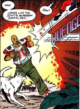 He was a regular of the Event Horizon, an intergalactic rave that featured hipsters and partiers from all over the Milky Way Galaxy. Though at first it was unclear what, if any, powers he possessed, it became apparent that his vest, later revealed to be the "Achilles Vest", emitted a force field that protected him from most forms of physical assault. He was somehow able to steal this from the lair of the Scavenger, a villainous packrat who stockpiles various items and gadgets from the known universe.