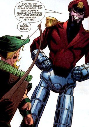 High-Rise was hired by Brick to act as security for an arms shipment earmarked for him. Green Arrow and Speedy broke up the deal, and High-Rise attacked them, spouting off as though he was already a major player in the supervillain world. Speedy took him down with a glue-arrow.