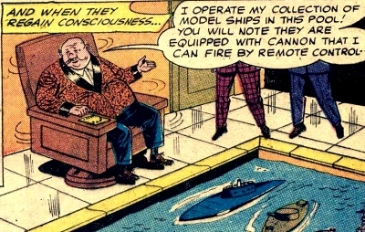 The Hobby Robber started a crime wave in Gotham City, stealing rare items from wealthy hobbyists. He first sent his men to steal a rare, giant golden coin for his collection, but this attempt was thwarted by Batman, Robin and Batwoman. After reading a newspaper about a crate of rare books being delivered to millionaire J.E. Newton, he made it his mens' next target. Little did he know, Batman and Robin had snuck into the crates in order to get the drop on the Hobby Robber and his gang. However, when Batman accidentally revealed himself through a groan, the Robber placed the two heroes in the pool in his room of model ships.