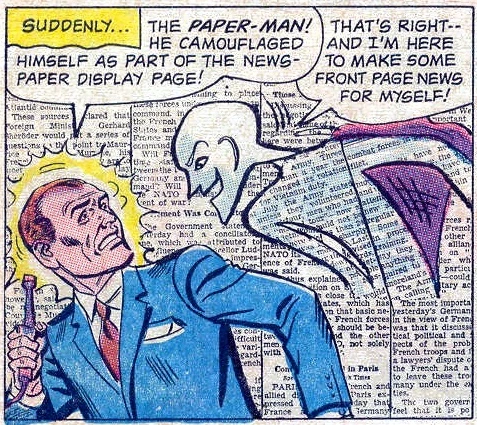- Unique Physiology: The Paper-Man is paper-thin. He retains a roughly humanoid shape, but can disguise himself as other paper surfaces that are both smaller and bigger than he is himself, like posters and type machine paper.