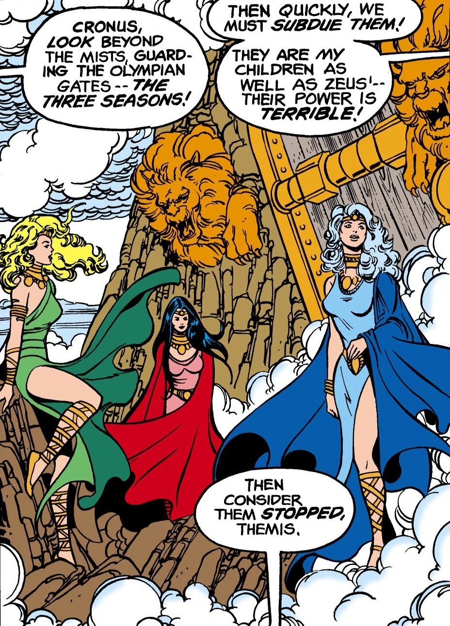 Goddesses associated with the course of the seasons, they preside over the order of nature and order in general. They are daughters of Zeus, the king of the Olympian gods, and Themis, the Titan goddess of justice, and are the guardians of the gates of Mount Olympus.[1]