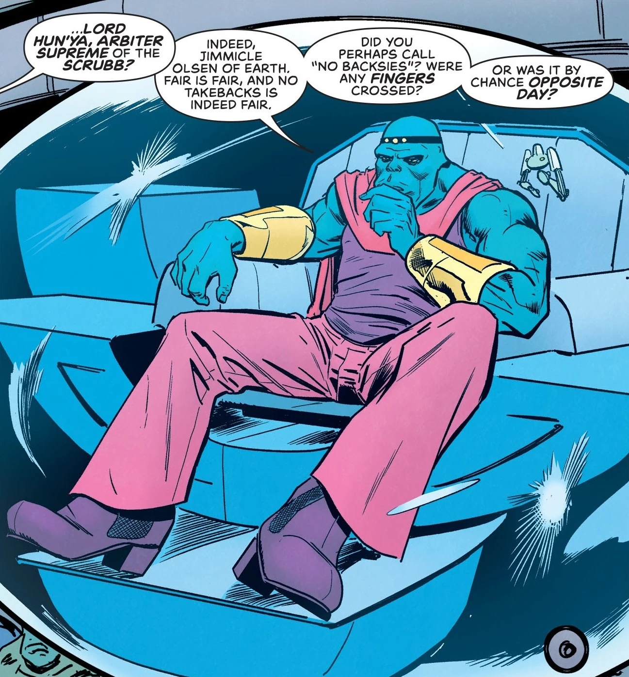 Hun'ya was the chosen champion of the Scrubbs. He had to defeat Earth's champion Harley Quinn for the fate of the planet. Harely was victorious and the Scrubb leader was proven to be a liar when he tried to destroy Earth anyway. This went against the Scrubb warrior code and Hun'ya deposed him as leader.[1] When Jimmy Olsen appealed to the Empire's sense of fair play, Hun'ya pledged his peoples' support to aid Jimmy against an alien warlord.[2]