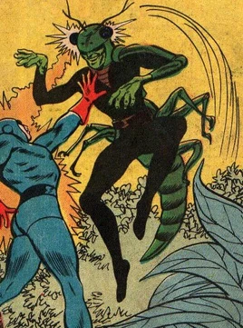 Hunter Mann experimented on ways to grow larger and heartier plants and animals. One such experiment with chlorophyl turned his skin green. He created an entire valley of oversized predators which attracted the attention of the Blue Beetle. Donning a costume, Mann attacked Beetle but he was defeated.[1] Mantis Man returned with a new plan to kidnap enough humans to start a small colony and destroy the rest of civilization with giant bugs. Beetle became aware of the plan and tracked Mantis to the Great Smoky Mountains where he put an end to Mantis Man's plans with a powerful bug spray.[2]