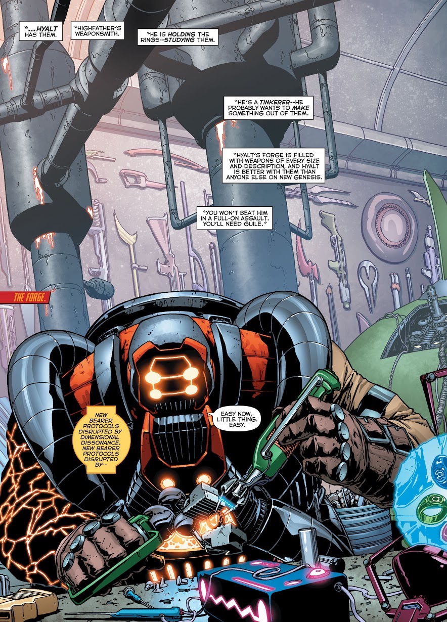 Hyalt was tasked with building a scepter capable of first handling the seven Power Rings,[1] then attempting to do intense research into the various rings stolen by the New Gods in order to try to find a way to the Life Equation within them, without success.[2] During the escape of Green Lantern Simon Baz and Red Lantern Guy Gardner from the Miracle Cells, the two ambushed Hyalt's forge, assailing him with bombs of Red and Green Lantern energy and blowing up the workshop in the process,[3] though he survived the assault himself.[4]